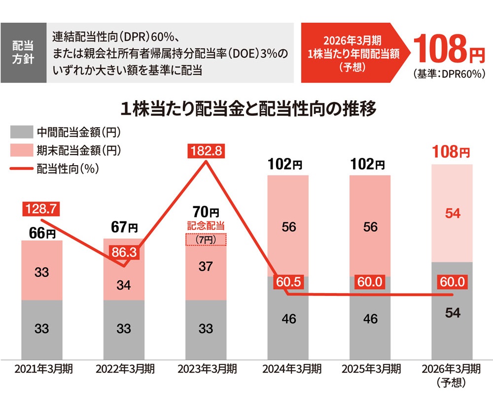 配当の継続性・安定性を保持するため、連結配当性向(DPR)60%、または親会社所有者帰属持分配当率(DOE)3%のいずれか大きい額を基準に配当を実施します。