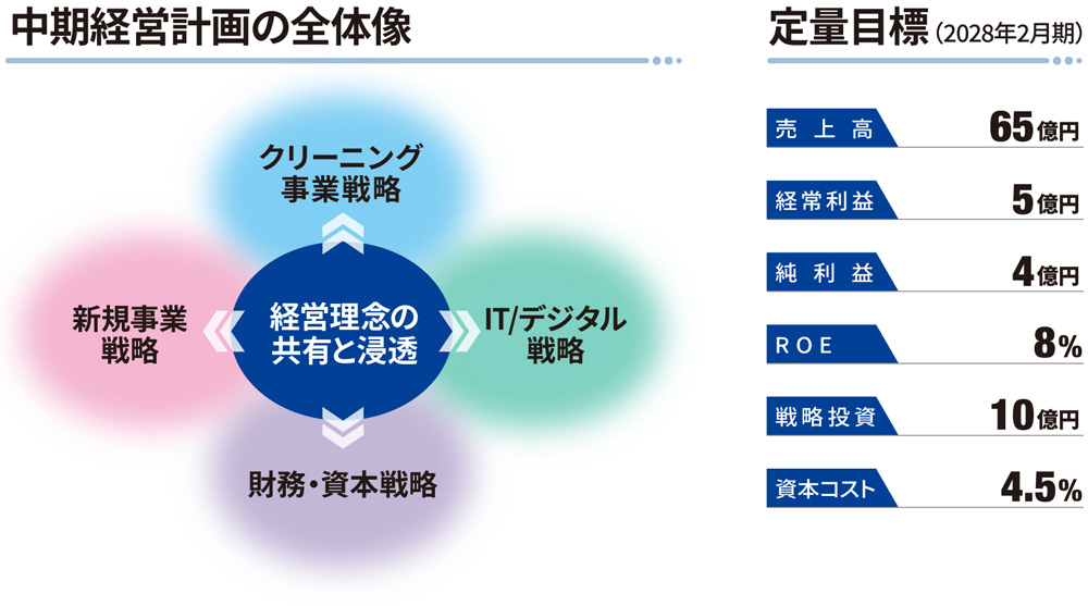 当社は、 2028年2月期までの3カ年を対象とする 「中期経営計画 NBM2025~2027」 を策定しました。 同計画では、 経営理念である 「融和」 「変革」 「貢献」 の共有と浸透を図りながら、 クリーニング事業戦略、 IT/デジタル戦略、 財務・資本戦略、 新規事業戦略を推進。 クリーニング事業戦略では、 需要の掘り起こしと世代別の価値提供を実施し、 需要の見込める重点地域に積極出店するなど、 店舗ネットワークの構築と効率的な工場運営を目指します。