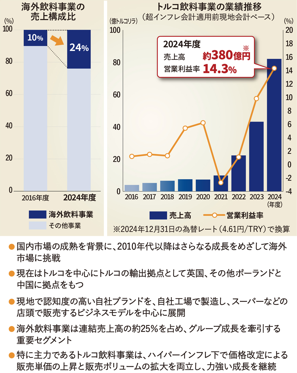 - 「こころとからだに、おいしいものを。」のブランドメッセージのもと、飲料・食品から医薬品まで幅広い商品を届ける。自販機を主力販路とする飲料事業のダイドードリンコを中核とし、フルーツゼリー市場トップシェアを誇るたらみ、ドリンク剤・パウチ製品の受託製造を担う大同薬品工業をグループ傘下に持ち、トルコやポーランドを中心に、海外でも飲料事業を展開。2019年には希少疾病用医薬品事業にも参入し、グループの事業領域の拡大を進める。
