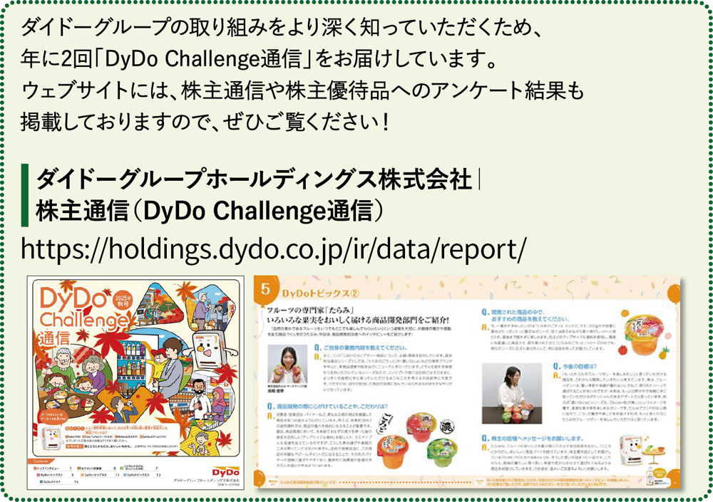 当社は2030年のありたい姿として、グループミッション2030「世界中の人々の楽しく健やかな暮らしをクリエイトするDyDoグループへ」 を定め、国内飲料事業のイノベーション、海外での事業展開の拡大、そして、非飲料事業での第2の柱の構築をめざしています。直近では、現地企業の買収によりポーランド飲料市場へ参入したほか、希少疾病用医薬品事業において当社初の新薬を販売するなど、着実に歩みを進めております。これからも、事業環境の変化に柔軟に対応し、ステークホルダーの皆さまとの共存共栄を図りながら、企業価値の向上に取り組んでいきます。