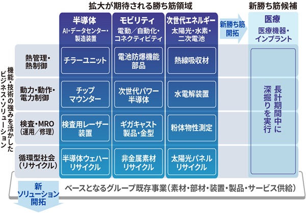 長期経営計画2030では、グループ収益力の安定性と成長力を高めること等を掲げ、「勝ち筋」と「ソリューション」が交わる領域をホットスポットと捉えて注力していきます(下図参照)。加えて新たな勝ち筋とソリューションの開拓も継続し、パーパス・ビジョンの具現化に努めてまいります。