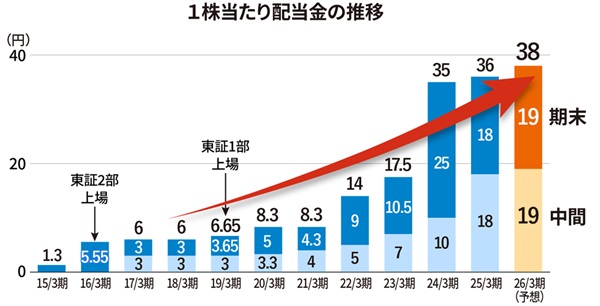* 2015年8月3日に1:5、2016年9月1日に1:3、2021年10月1日に1:1.5、2023年11月1日に1:2の割合で株式分割を行っており、配当については当該株式分割を考慮して算定