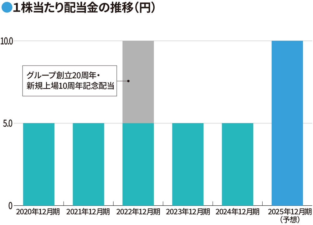 当社は配当水準について明確な基準を設け、連結配当性向30%以上を基準として配当を実施することといたしました。資本コストや株価を意識した経営の実現に向けた取り組みの一環であり、株主の皆さまへの利益還元を一層強化し、中長期的な利益成長に応じた安定的かつ持続的な株主還元を目指すものです。この方針のもと、 2025年12月期の1株当たり配当金は、当初予想の5円から10円に増配しました。