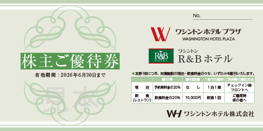 ワシントンホテルプラザおよびワシントンR&Bホテル宿泊もしくは飲食20%割引株主優待券