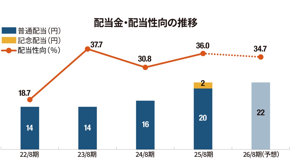 2025年8月期の期末配当は、期初予想の1株当たり18円に、創業70周年の記念配当2円を実施するとともに、業績等を勘案して2円増配し、合計22円としました。