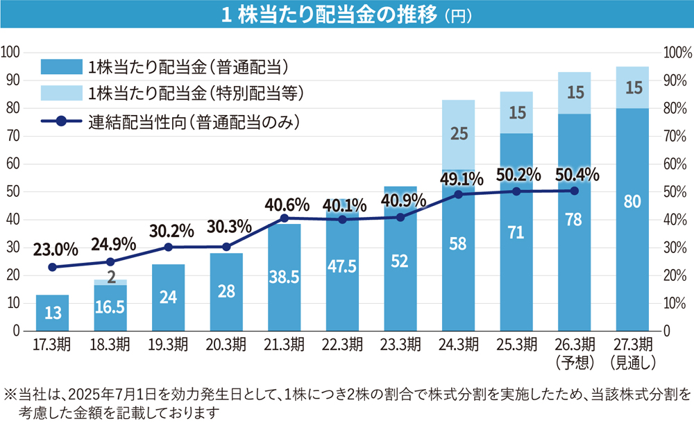 当社は中期経営計画の株主還元方針を「連結配当性向50%程度(2024年度~2026年度)とし、自己株式取得については株価水準、投資計画および財務状況等を総合的に勘案し、機動的に実施」と定めており、業界内でも高水準の株主還元を実施しております。また、EPSの継続的な向上等を背景に、2026年3月期の1株当たり配当金は9期連続の増配予想としております。