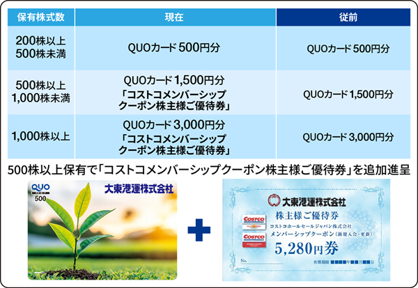 当社株式への投資の魅力を高めるため、取引先であるコストコホールセールジャパン株式会社とのコラボレーションで、保有株式数500株以上の株主さまに、同社の「メンバーシップクーポン株主様ご優待券」を追加で進呈します。