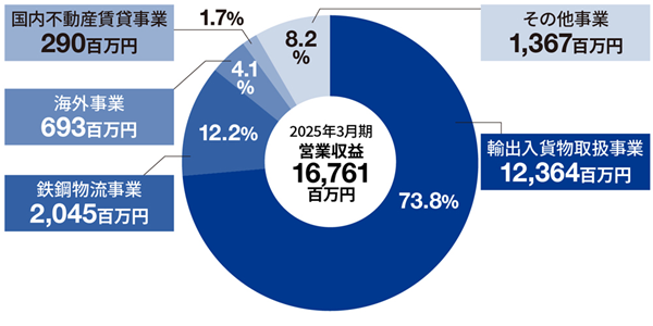 当社では、「輸出入貨物取扱事業」「鉄鋼物流事業」「海外事業」「国内不動産賃貸事業」「その他事業」の5つのセグメントで事業展開しています。主力は「輸出入貨物取扱事業」(売上構成比率73.8%)となっています。