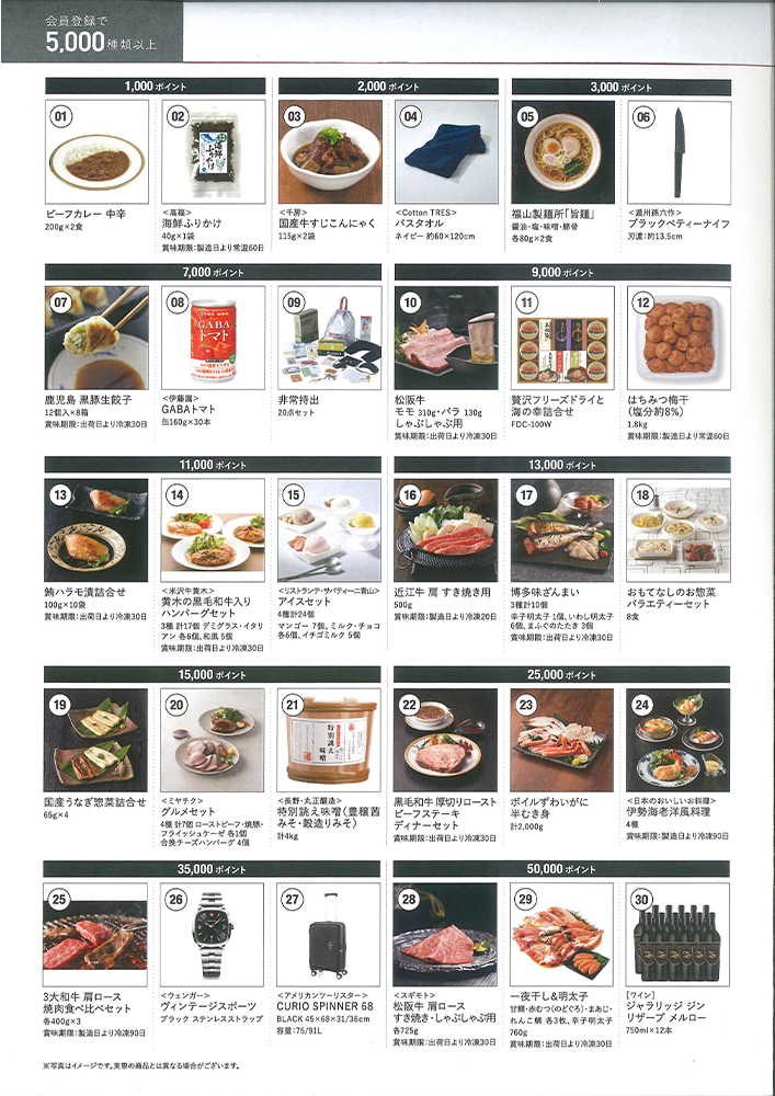 食品、電化製品、雑貨などと交換可能なポイント、5,000ポイントを付与